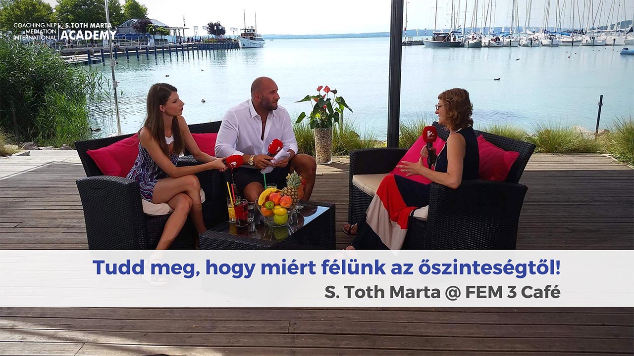 “S. Tóth Márta FEM3 Café nézőinek a kérdéseire válaszolt. A coach elárulta, a megfelelési vágy miatt félünk az őszinteségtől. Nem szabad azzal foglalkoznunk, hogy a társadalom mit vár el tőlünk. Elsősorban saját magunkkal kell őszintének lennünk, félelmeinket és vágyainkat tisztáznunk kell a környezetünkkel is.”