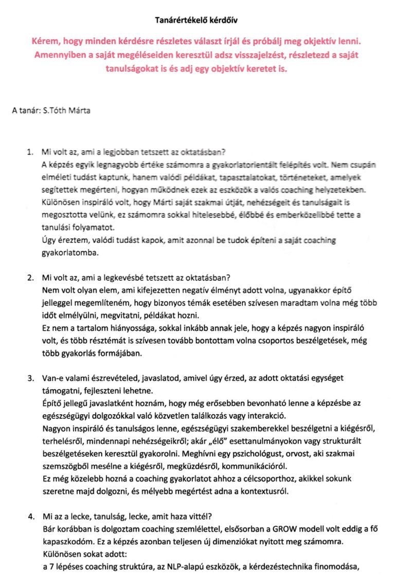 A tananyag és a képzés hatékony, egyértelmű, átlátható és érthető. A képzés alatt rengeteget fejlődött az önismeretem, és értékes gyakorlati tapasztalatokkal gazdagodtam a coaching terén. Mártinak egy csodálatos oktató csapata van, empatikusak és kíváló szakmai ismeretekkel rendelkeznek. A tananyag elsajátításában támogatóak, szívvel-lélekkel adták át tudásukat.